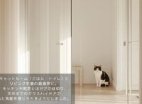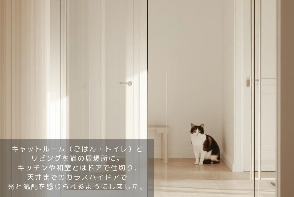 キッチンとキャットルームをガラスで仕切り、お互いの気配を感じながらも快適過ごせる空間に。