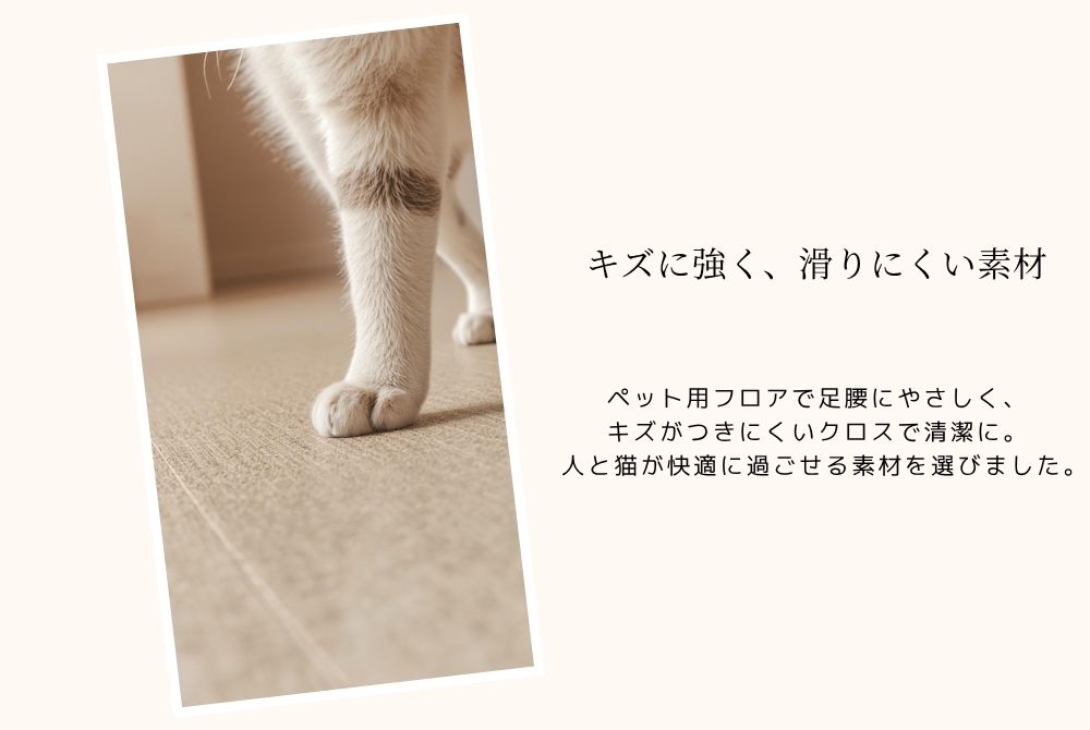 滑りにくいフロア材やキズに強いクロスなど、小さなこだわりが毎日の暮らしをやさしく支えます。